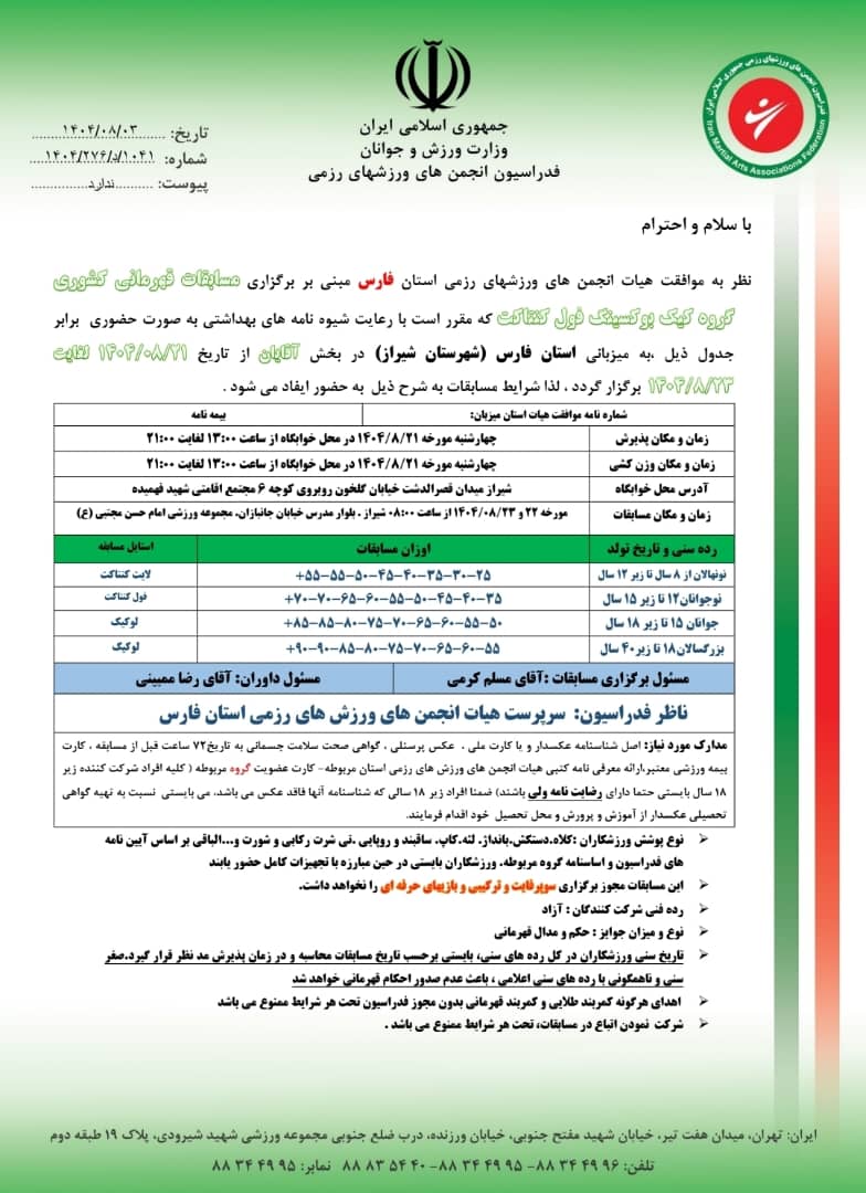 به گزارش خبرنگار پایگاه خبری فارس به روز ، مسابقات قهرمان کشوری کیک بوکسینگ فول کنتاکت یادواره شهید احسان بخشنده در استان فارس شهر شیراز سومین حرم اهل بیت ع با شرکت بیش از ۶۰۰ ورزشکار از سراسر ایران اسلامی در چهار رده سنی آقایان در استایل های مصوب فدراسیون ورزش های رزمی برگزار می شود.