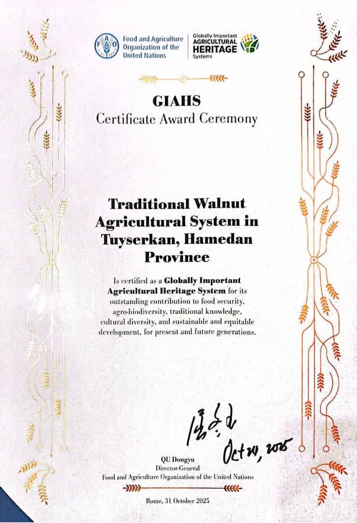 ۰۸:۱۵ - ۱۴۰۴/۰۸/۱۰گواهی جهانی GIAHS برای باغات انجیر دیم ایران در رم به ثبت رسید.