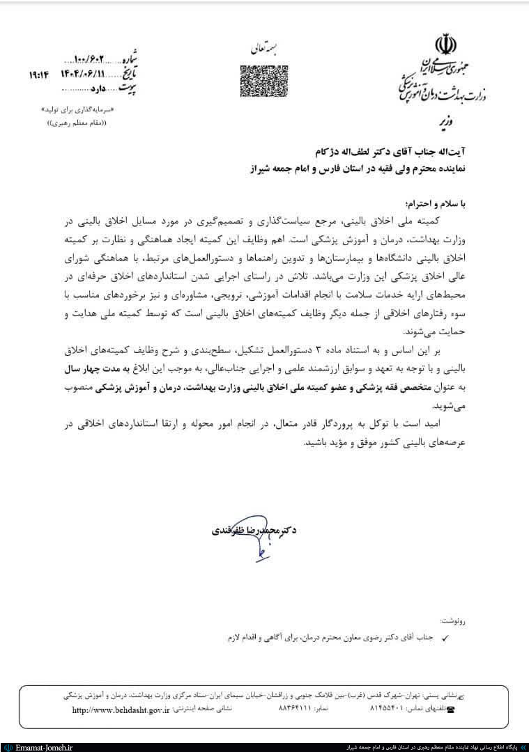 ۱۳:۴۰ - ۱۴۰۴/۰۷/۱۲وزیر بهداشت با صدور حکمی امام جمعه شیراز را به عنوان متخصص فقه پزشکی و عضو کمیته ملی اخلاق بالینی وزارت بهداشت منصوب کرد.